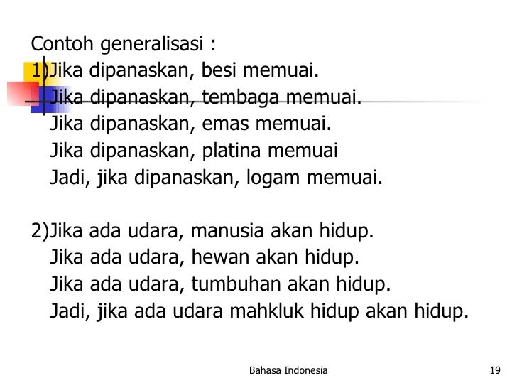 Kesimpulan paragraf generalisasi di atas terdapat pada kalimat terakhir. Paragraf generalisasi ialah paragraf yang memberikan penalaran induktif melalui tahap penarikan kesimpulan dari data yang sudah ada. Sekarang, kita akan mulai dengan generalisasi, salah satu jenis penalaran induktif. Banyak pedagang kaki lima yang entah bagaimana awalnya, seperti mengelompokkan diri hanya dengan menjual jenis barang tertentu di sebuah trotoar tertentu. Anto akan menjadi presiden karena dia adalah anggota tni. Jika si pelaku mengamati pola tersebut, dia akan mengamati bahwa jumlah sisi dalam bentuk meningkat satu dan karenanya generalisasi pola ini. Berikut adalah beberapa contoh yang akan meningkatkan pemahaman anda tentang penalaran induktif. Contoh 1 belajar sampai tengah malam bahkan tidak tidur bukanlah hal yang baik, jika. Semua bintang sinetron berparas cantik. Jika kita mengambil kesimpulan tentang seluruh kelompok berdasarkan informasi tentang sebagian anggotanya, maka kita melakukan generalisasi. Beberapa bentuk penalaran induktif adalah sebagai berikut. Penalaran induktif adalah jenis pemikiran logis yang melibatkan pembentuk generalisasi berdasarkan insiden spesifik yang anda alami karyawan ini mempraktikkan penalaran induktif. Generalisasi dibuktikan dengan data, contoh, statistic dll contoh :